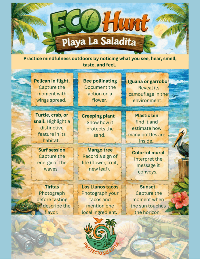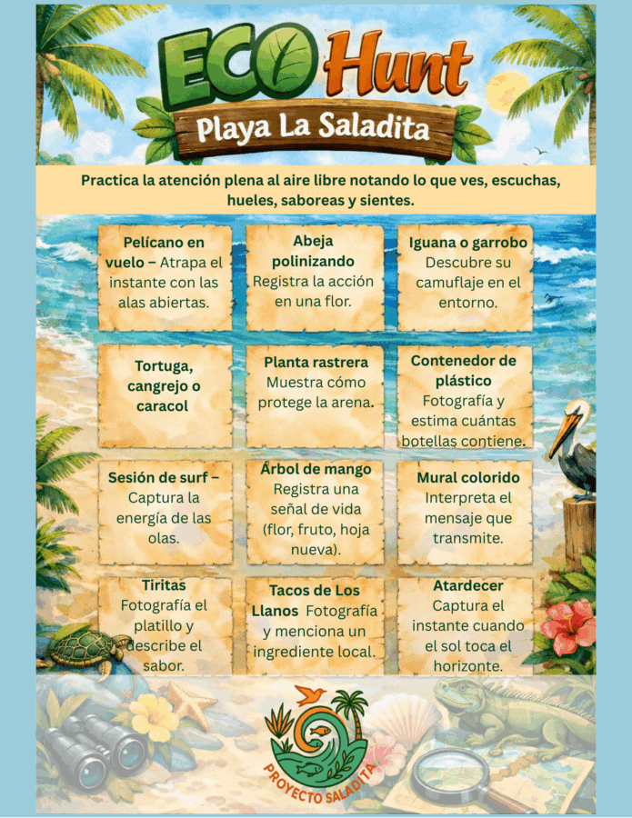 Eco Hunt Saladita is an interactive game to discover the beach in a new way. It’s an invitation to reconnect with nature, observe it with curiosity, and care for it with respect. Eco Hunt La Saladita es un juego interactivo para descubrir la playa de una manera diferente. Es una invitación a reconectar con la naturaleza, observarla con curiosidad y cuidarla con respeto.