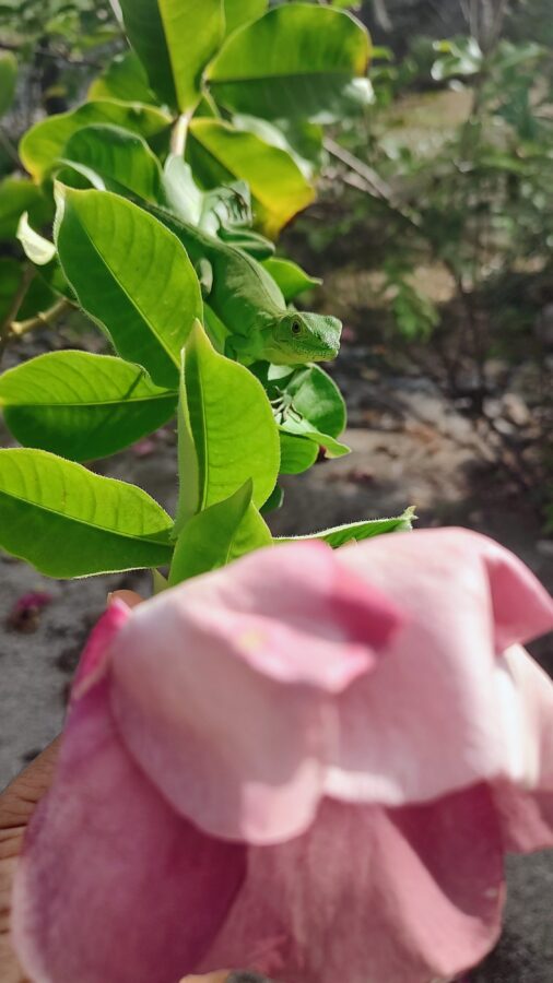 “Iguana verde camuflajeada entre las flores de mi jardín en Playa la Saladita“
